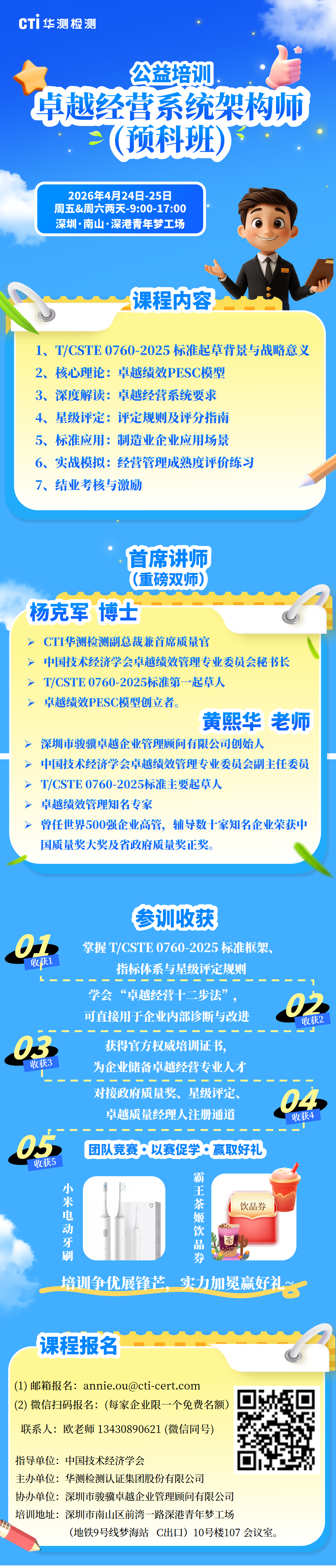 制造业是立国之本、强国之基,新质生产力培育离不开管理模式的系统革新,卓越绩效模式正是企业实现高质量发展的核心抓手。为全面贯彻习近平总书记在二十大提出的“加快建设世界一流企业”精神,落实《质量强国建设纲要》部署,由中国技术经济学会归口、CTI 华测检测牵头起草的我国制造业首部 “全流程经营系统 + 全周期成熟度评定” 原创团体标准《T/CSTE 0760-2025 制造业企业卓越经营系统要求及星级评定》已正式实施,为企业迈向卓越提供标准化路径。现中国技术经济学会授权 CTI 华测检测开展公益培训,首期深圳班将助力企业掌握卓越绩效PESC模型、标准核心精髓与企业如何应用等,提升自我诊断与绩效改进能力,现就培训事宜通知如下。