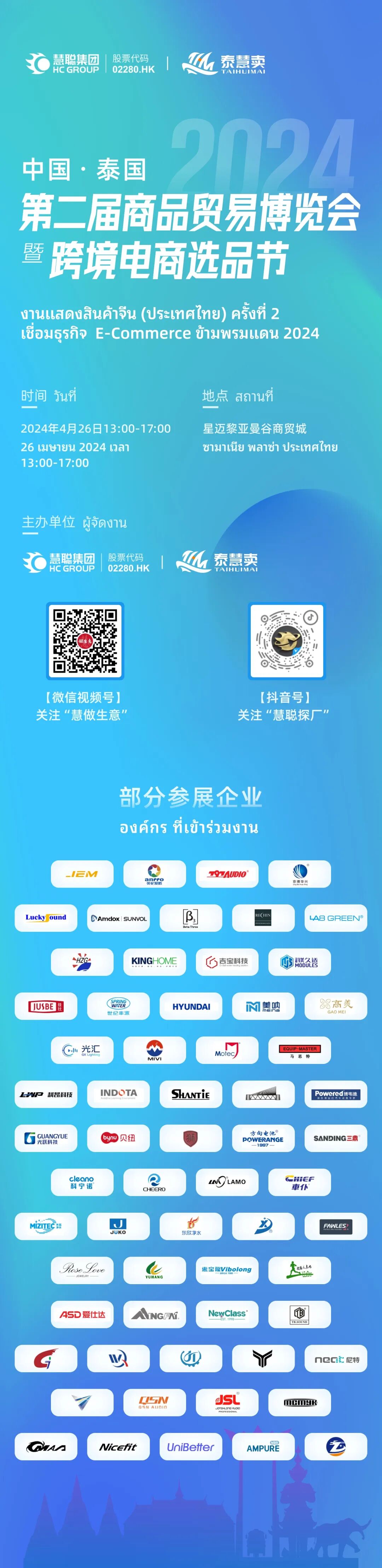 第二届中国·泰国商品贸易博览会即将在4月26号隆重举行,此次博览会超过100家中国顶尖制造业企业踊跃报名,展出1500多个品类、超过18000种商品,涵盖广泛行业!携手慧聪,共探泰国市场的无限可能!
