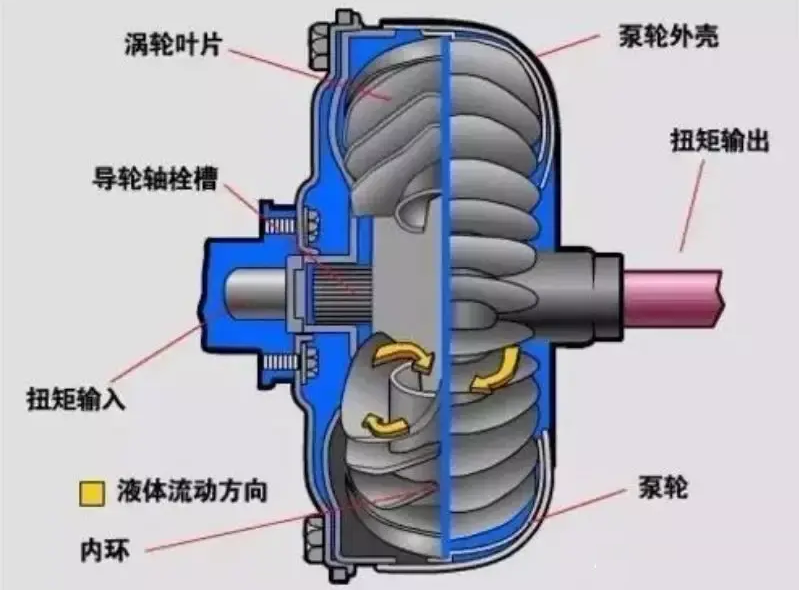 由泵轮、涡轮、导轮组成的液力元件。安装在发动机和变速器之间,以液压油为工作介质,起传递转矩、变矩、变速及离合的作用。